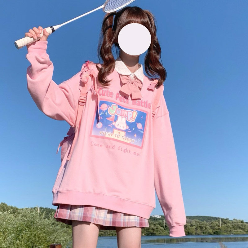 日系原创设计可爱甜美粉色宽松圆领套头卫衣女秋季百搭薄款上衣热门设计联盟服务商