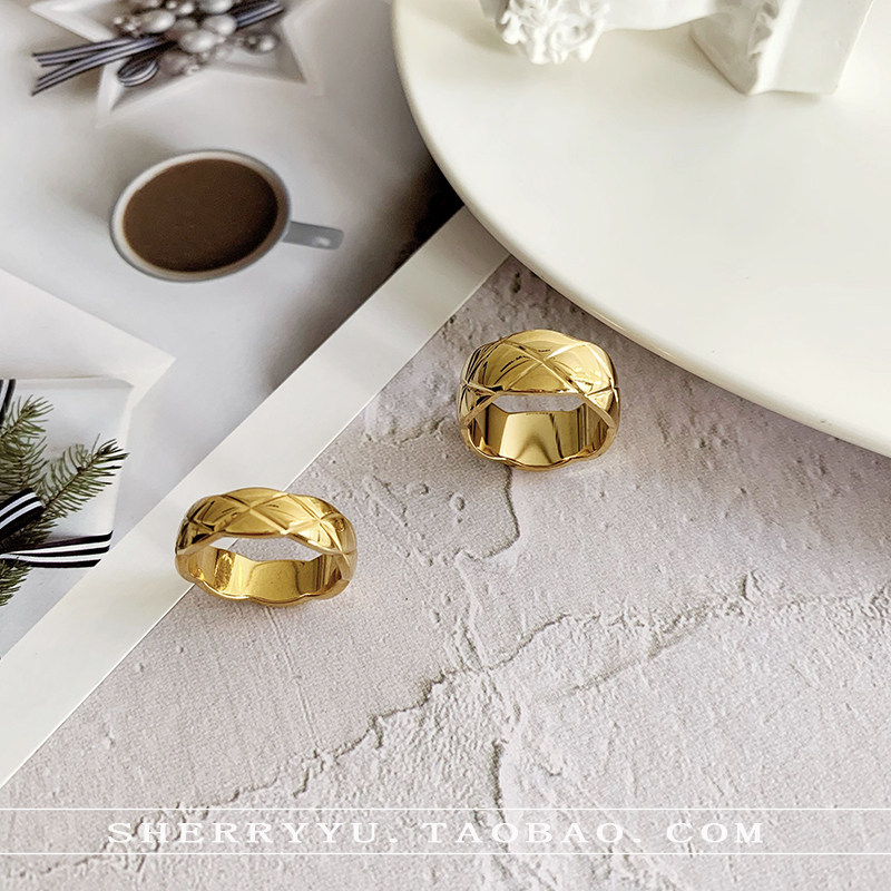 欧美小香风菱格纹戒指金叠戴法式设计钛钢素圈指环明星同款不掉色热门设计联盟服务商